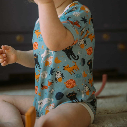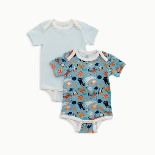 ORGANIC COTTON BABY SHORT SLEEVE BODYSUIT, 2-PACK | SPACE CATS + SOLID BLUE