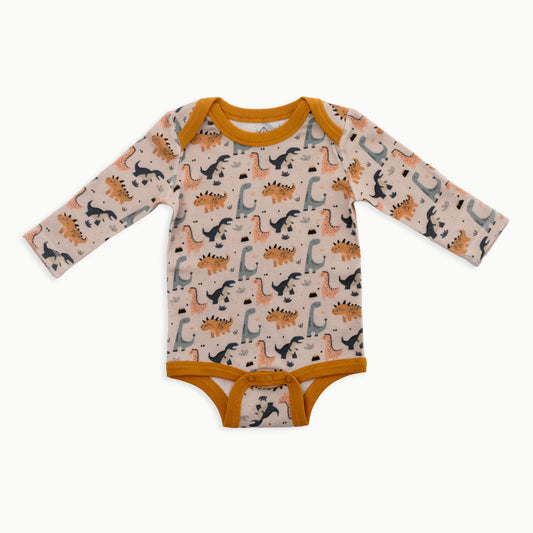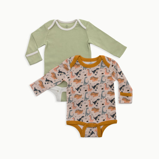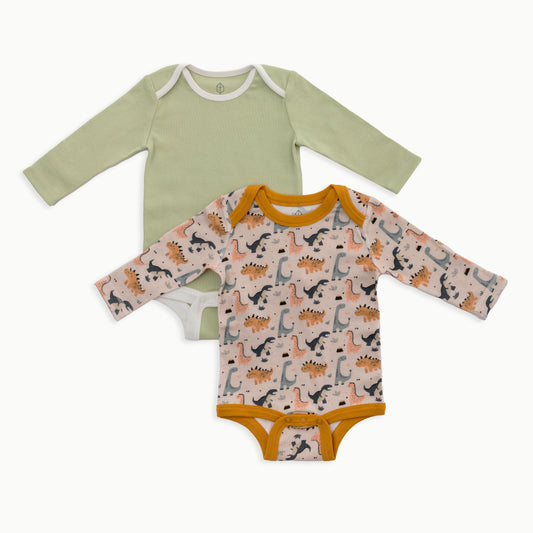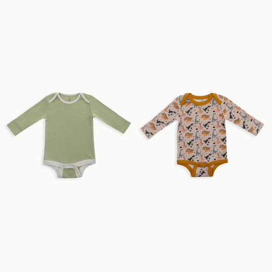 ORGANIC COTTON BABY LONG SLEEVE BODYSUIT, 2-PACK | DINOSAUR + SOLID GREEN