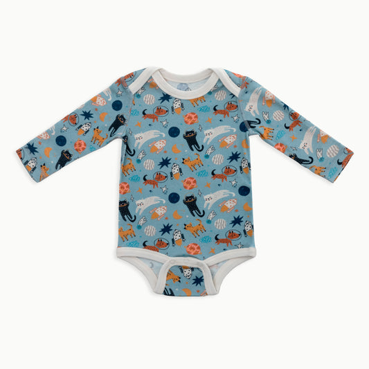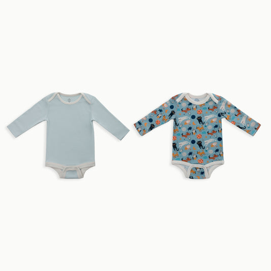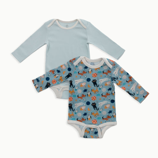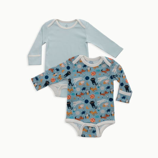 ORGANIC COTTON BABY LONG SLEEVE BODYSUIT, 2-PACK | SPACE CATS + SOLID BLUE