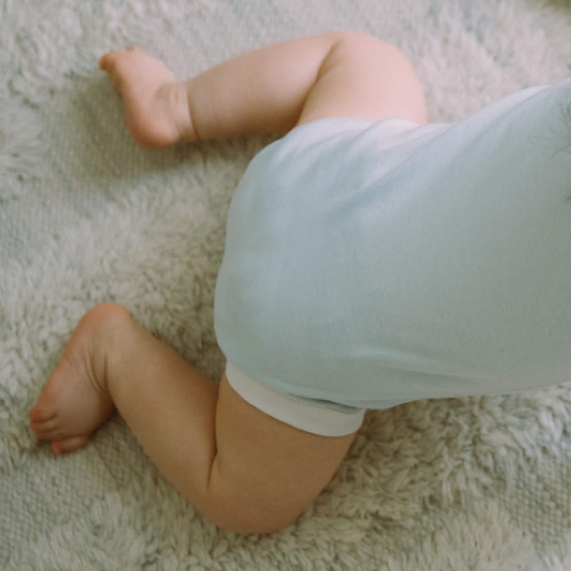 Lap-neck design for easy changes. Fold-over mittens in sizes 9-12 months and under. Hypoallergenic and made from 100% organic cotton. Nickel-free snaps for sensitive skin. Dyed with GOTS-certified, water-based dyes—free from AZO toxins.