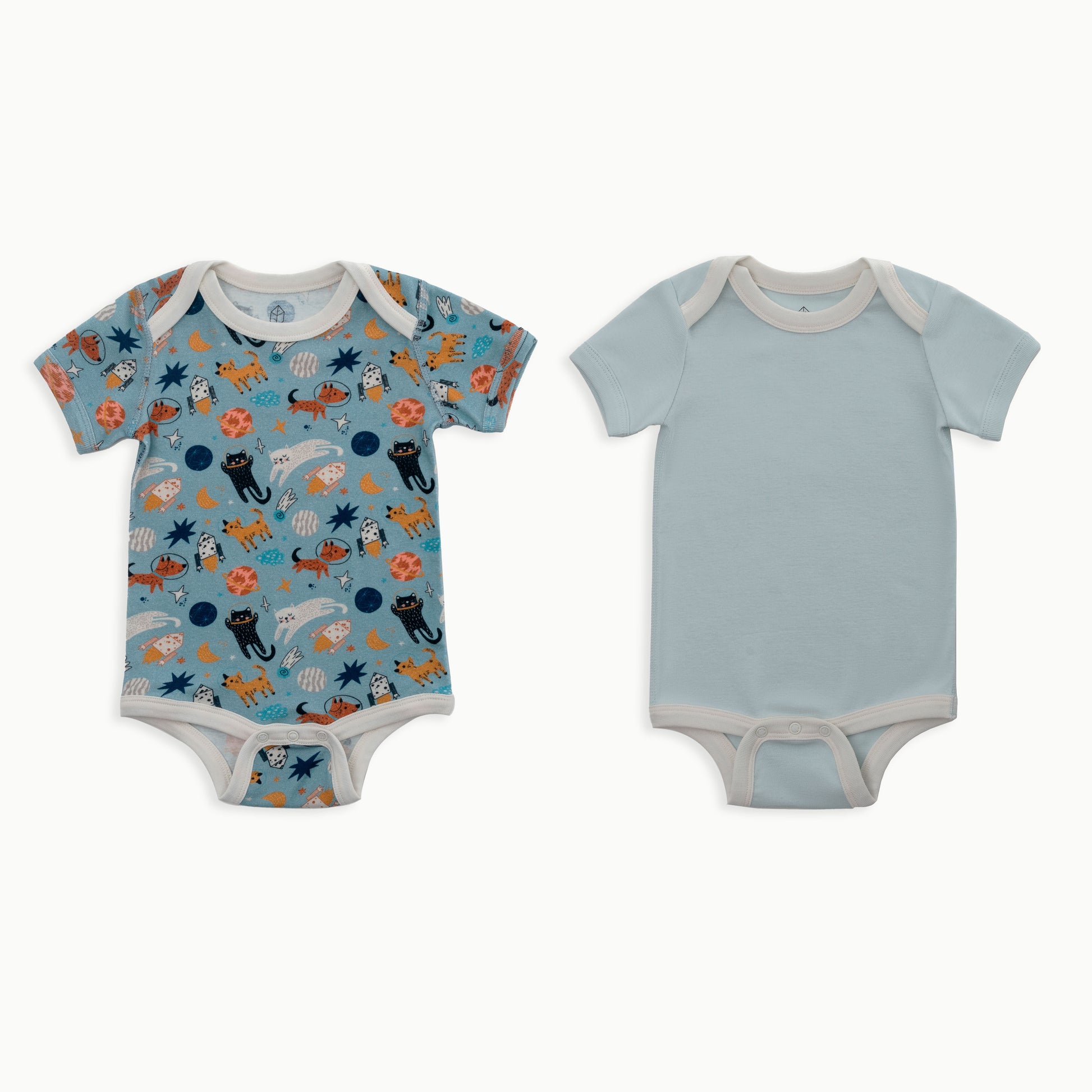 Organic Cotton Baby Short Sleeve Bodysuit, 2-Pack | Space Cats + Solid Blue