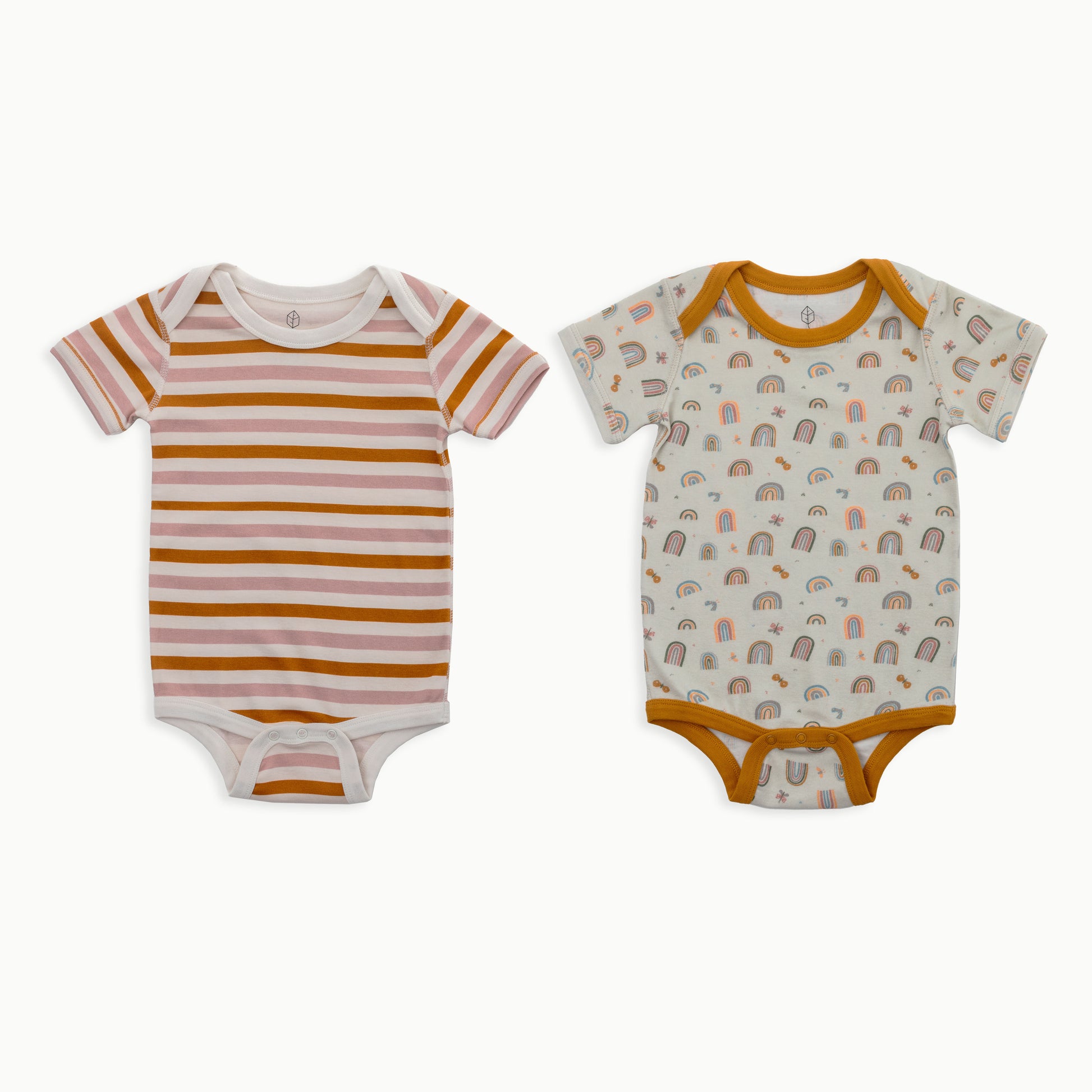Includes: 2 Short Sleeve Bodysuits (Rainbows + Striped).